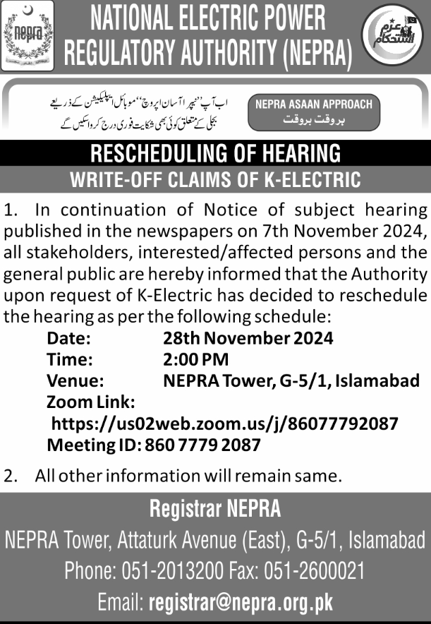 Rescheduling of Hearing - Write-Off Claims of K-Electric