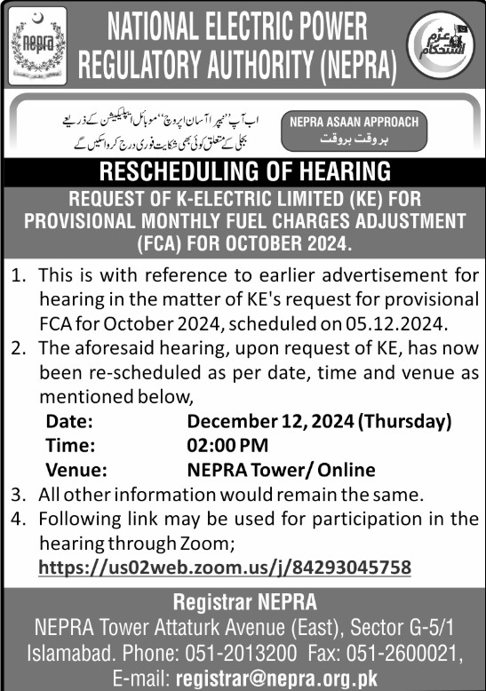 Rescheduling of Hearing - Request of KE for Provisional monthly FCA for October 2024