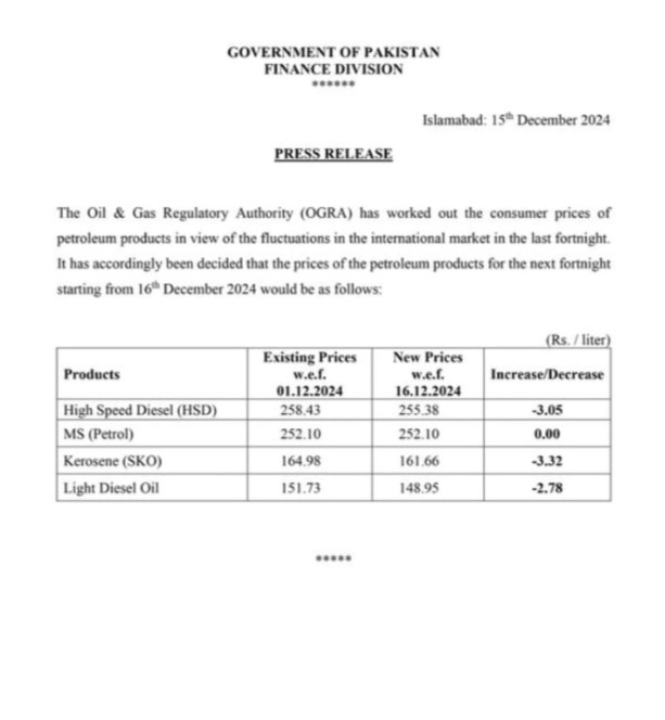 POL prices notification dated 15.12.24