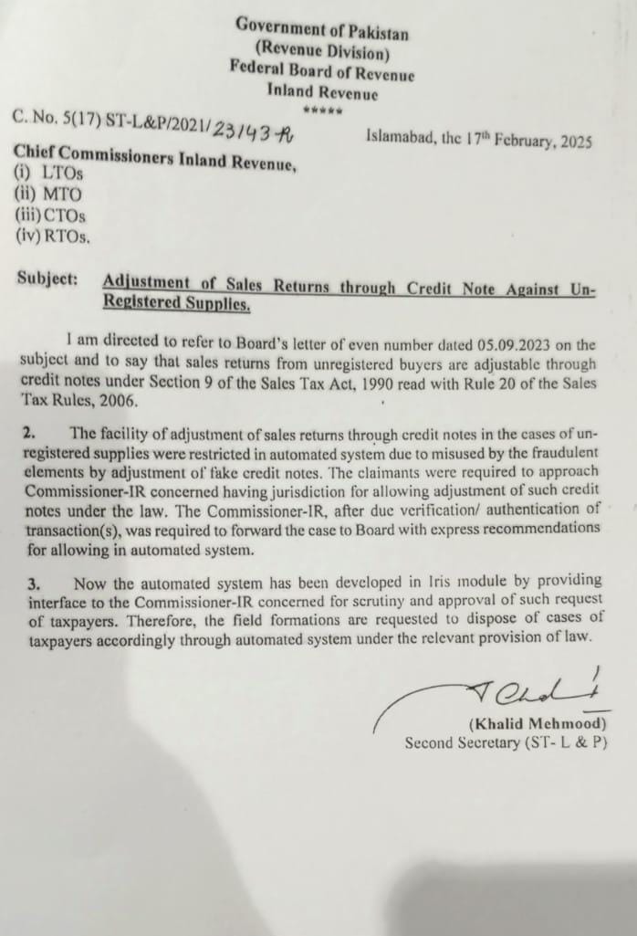 Adjustment of Sales Returns through Credit Note Against Un-Registered Supplies.