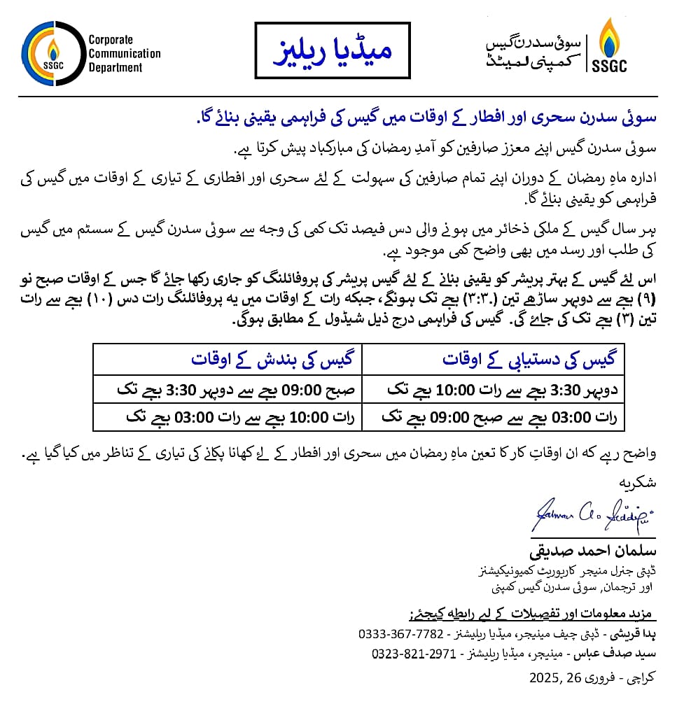 Gas Supply Timings for Karachi, Quetta other SSGC controlled areas