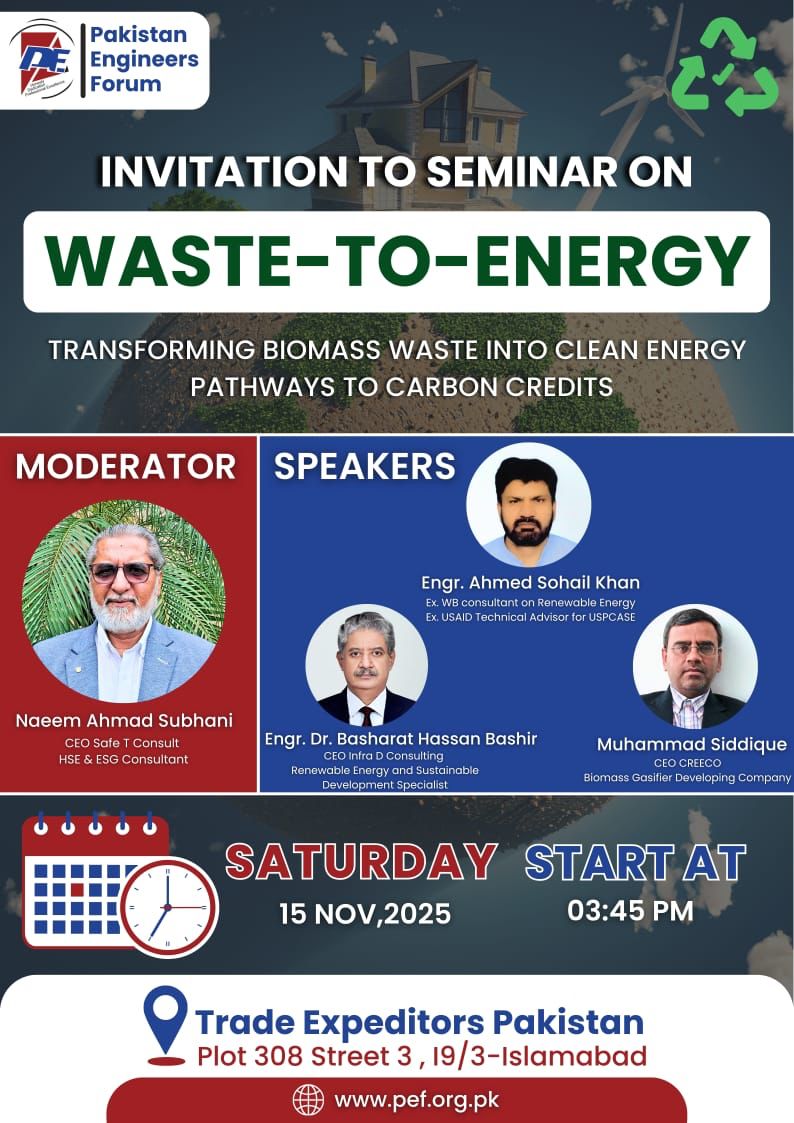 Pakistan Engineers Forum to Host Seminar on “Waste-to-Energy: Transforming Biomass into Clean Energy & Carbon Credits”