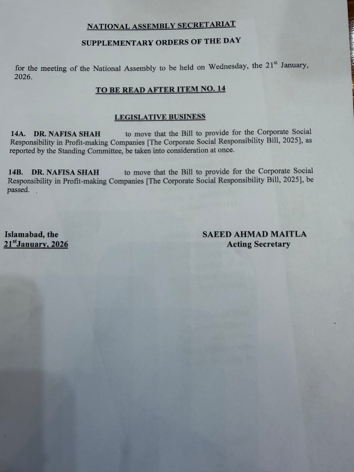 NA order of the day The Corporate Scoial Responsibility Bill 2025 dated 21.1.26